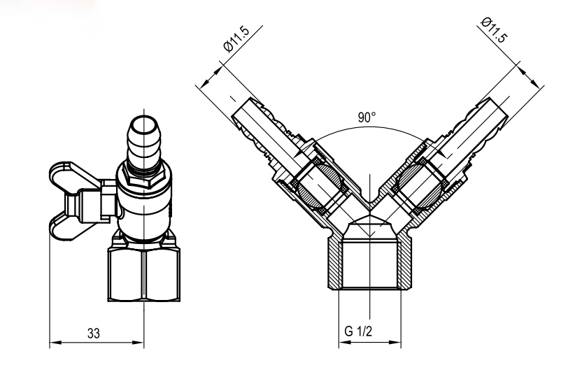 • Конструкция с одним входом и двумя выходами: один вход с наружной резьбой и два выхода для шланговых штуцеров, что позволяет одновременно подавать воду на два устройства, уменьшая разветвления трубопровода и точки утечки.